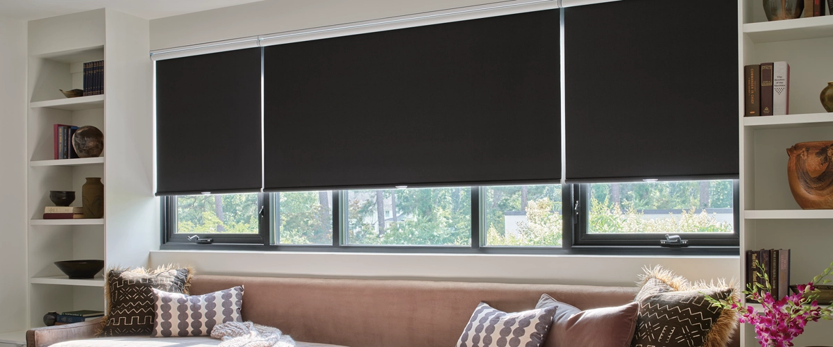 HUNTER DOUGLAS DESIGNER SCREEN SHADES WITH ADDED BLACK FASCIA